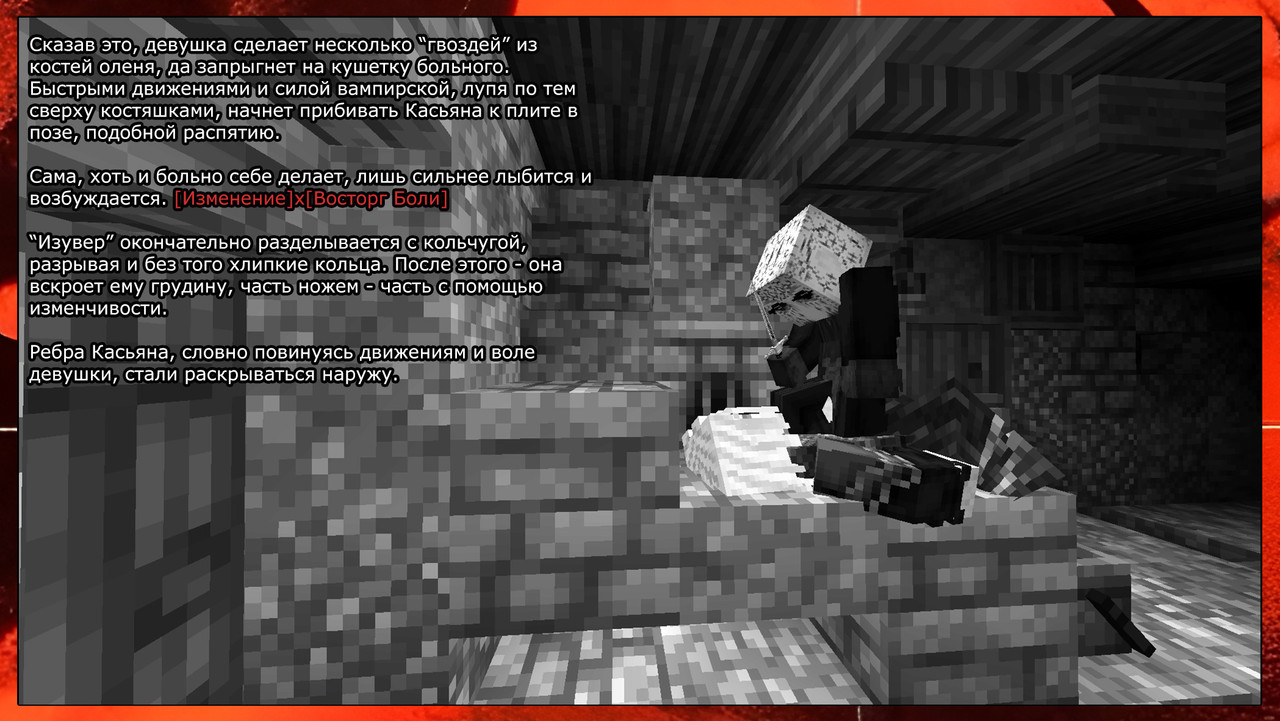 А он, тем временем, обратив сразу нескольких человек, но втайне хотел оставить своим чайлдом лишь одного - наиболее способного в его понимании. Отделив птенцов друг от друга живыми перегородками, он по очереди учил их искусству лепки плоти. Шаг за шагом, ночь за ночью он показывал как растягивать мышцы, отделять жир и деформировать кости, не забывая обильно поить учеников своей кровью - для покорности, в основном.