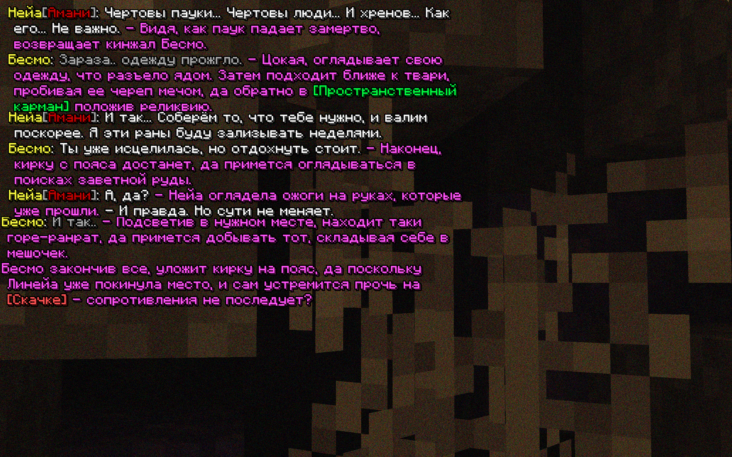 Главарь рассмеялся, но его смех оборвался, когда Нейа внезапно ударила того прямо в лицо. По её руке прямо в нос мужчины пробежала масса, похожая на чёрную смолу. Чуть пошатнувшись от неожиданности, тот взглянул на девочку с лютой ненавистью. Однако... Главарь захрипел, его глаза широко раскрылись от ужаса. Он попытался вдохнуть, но из его горла вырывались лишь булькающие звуки. Затем он рухнул на землю, из его носа и рта хлынула кровь. Нейа стояла над ним, дрожа всем телом. Она не понимала, что только что сделала.