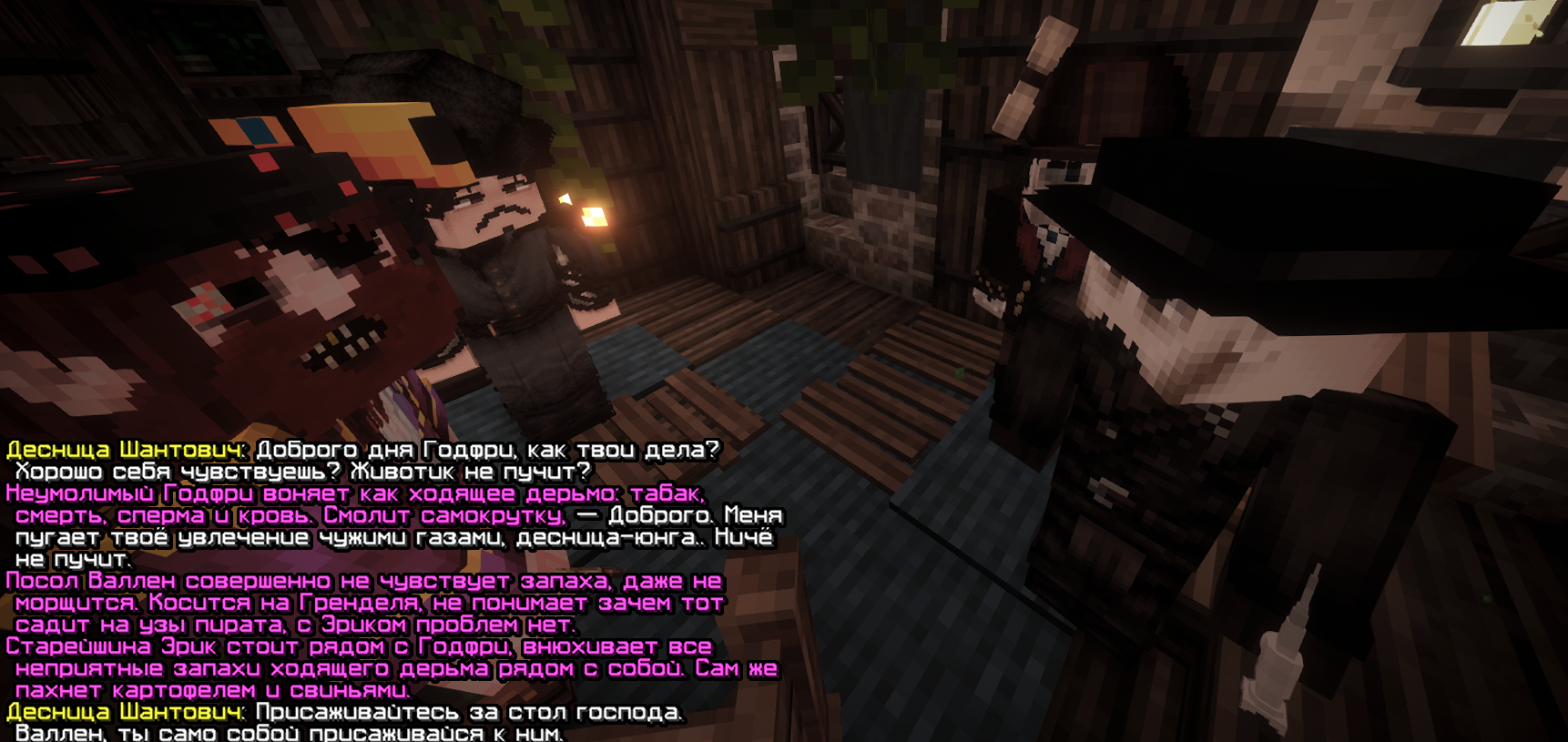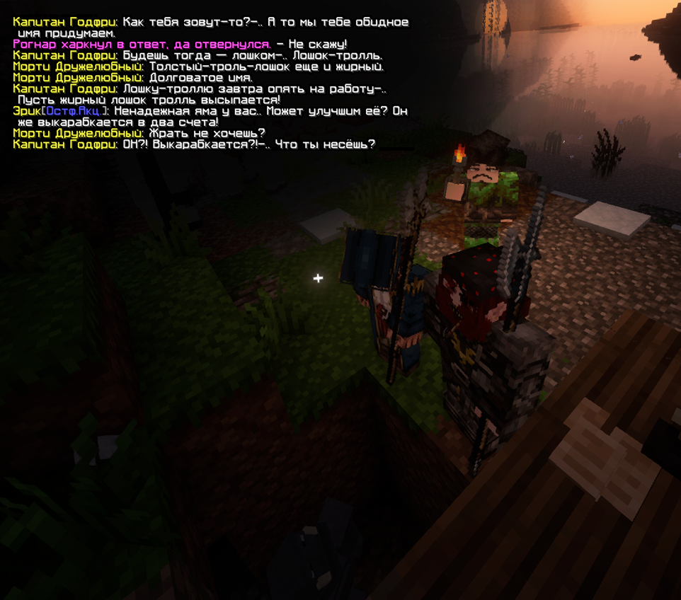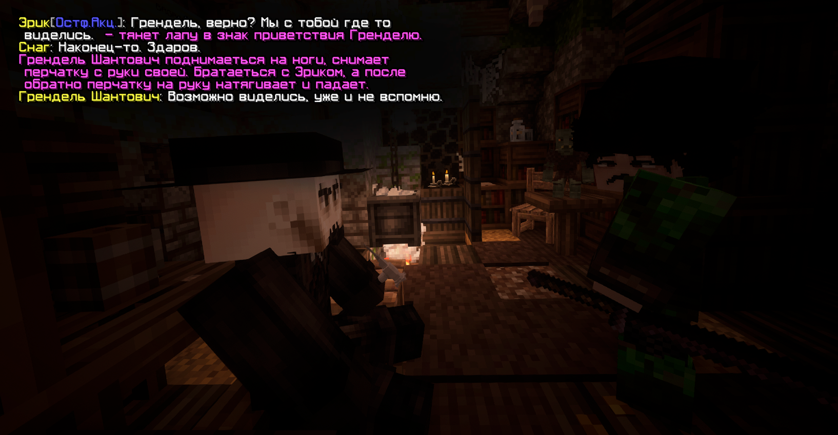 На совете по смену лидерства в поселении присутствовал и Грендель Шантович, с которым Эрик ранее пересекался при планировании диверсии на Дорпат. Они снова активно взаимодействовали, хоть и не многословно.