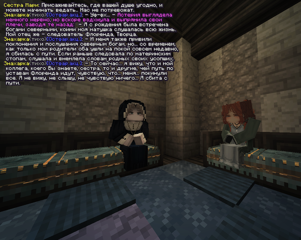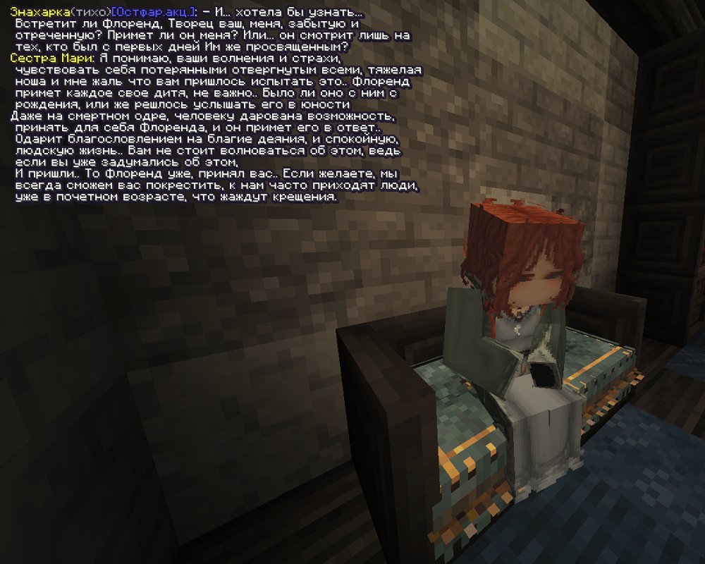 Везде Флоренд... Я чувствую себя замкнутой и мне было тяжело без фигурки Вереска. Даже и не подумала тогда его с родного дома забрать. Давным-давно... Больше мне становилось не по себе и решила влиться в общество. Обсудив с Эвераном касательно такого решения, пришла в монастырь.