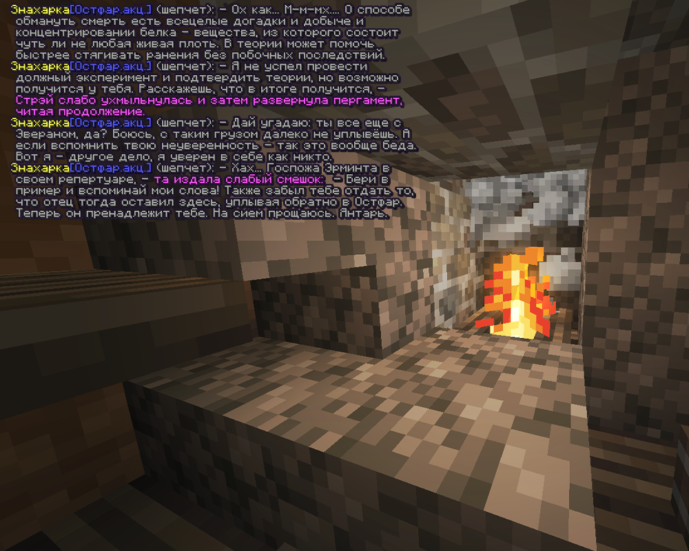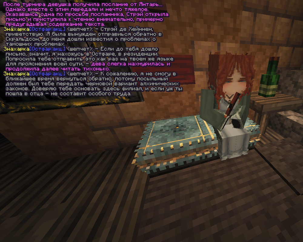“Я был раньше знаком с одним из умнейших ученым, что смог исцелить мое лицо, был знаком с одним из величайших танатохимиков, который являлся моим наставником, знал множество разумных лиц, что были моими коллегами и друзьями! Ты думаешь, я их не спрашивал? Думаешь, не пытался найти способ сделать твою мать счастливой, чтобы мы прожили как можно дольше? Чтобы ты смогла провести с нами больше времени пока не вознесемся к Флоренду! Сама знаешь, что алхимия способна погубить, если переборщить с ингредиентами, концентрацией или вовсе сделать что-то не то, превратить лекарство в смертельный яд! Если ты действительно желаешь помочь и сделать нас счастливыми - не лезь в передряги, не совершай ошибок, стоящих жизни. Захочешь в странствия - предупреди нас хотя бы письмом. Главное будь жива и здорова.”