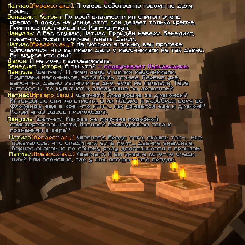 Питающийся - Хатим, так теперь его звали в течении следующего года всячески помогал всем членам культа в этой области чаще всего, помощь заключалась в похоронах умерших членов культа и просто не упокоенных тел. Но по совершеннолетию, которое наступало в этом обществе на двадцать третий год жизни был посвящен за свой труд в полноценные члены культа последователей Мессоремы пройдя обряд - "Дня рождения" и получив свою первую - темно-серую мантию с фиолетовой каймой. С этого этапа Хатим мог самостоятельно выступать и проводить "Анспер". Таким образом Хатим отправился на поиски того Варга, что заполз в голову почти на всю его сознательную жизнь, тем самым выбрав его первой жертвой от себя во славу Мессорема и само собой от мести. Долго искать не пришлось, ибо он уже знал где чаще всего вьются гиены в городах, не прошло и месяца как Хатим наткнулся на того злосчастного зверолюда, проходя мимо в одном из гадюшников города Аварошец отщипнул от гиены не заметно пару волос когда те столкнулись друг с дружкой. Следующим этапом было начало ритуала - вернувшись в храм принялся к началу действа. Уложив волос и благовоние на алтарь - Думающий, принялся поджигать особое благовоние от которого к счастью для Хатима пошел дым. От радости тот стукнул по краю алтаря кулаком. Следом взяв волос с алтаря принявшись вплетать этот самый волос в заранее приготовленную куклу которая вполне себе походила на гиену, уложив ту обратно на алтарь Хатим полил ее кровью сопровождая молитвой. Схватил свой ритуальный кинжал и повесив на пояс Думающий в спешке двинул к конюшне откуда и двинулся в то же мгновение на поиски принятой жертвы. По прибытию на место - это был город Нирр, он пару дней разыскивал эту гиену которая как оказалось двинула в один из портов по словам его знакомых из трактира друзей. Соответственно Хатим двинул по пятам, чтобы успеть - он извел эту лошадь, что та по прибытию просто свалилась набок под палящим солнцем. Петляя по порту он заметил как толпа стояла возле одного из кораблей где цель покупала место на борту, когда тот ушел Хатим сам подошел и купил этот себе аналогично гиене место на борту, чтобы пробраться на него. С наступлением ночи, аварошец спустился в каюту и разбудил спящего уже на своем месте гиену которая дожидалась утра на борту, чтобы отправиться в плавание на Флорес. Тряхнув того за плечо Хатим сказал гиене, что его вызывает к себе капитан, те вместе поднялись на палубу где Думающий проткнул свою жертву в сердце и скинул за борт в момент когда было менее людно, а после этого покинул судно и вместе с ним порт. По прибытию в храм Хатим встретил Слыщащий, который выразил свое недовольство, что тот выбрал сделал все самостоятельно не оповестив старших по чину соратников, но в тоже время выразил восхищение своим упорством и что такие случаи бывают очень редки когда Думающий сам выбирал и действовал без какой либо помощи и от того Слышащий взвал Хатима к ритуалу Рандара, который обозначал его повышение перейдя на ступень - "Желающего" получив свою новую, красную мантию с фиолетовой каймой.Спустя годы Хатим уже доказал не единожды свою преданность идеалам и вере во имя Мессорема, у него не было не семьи, не детей, что позволяло действовать без слабостей и его навыки, опыт и знания теперь требовалось передавать новым последователем, чем он и 