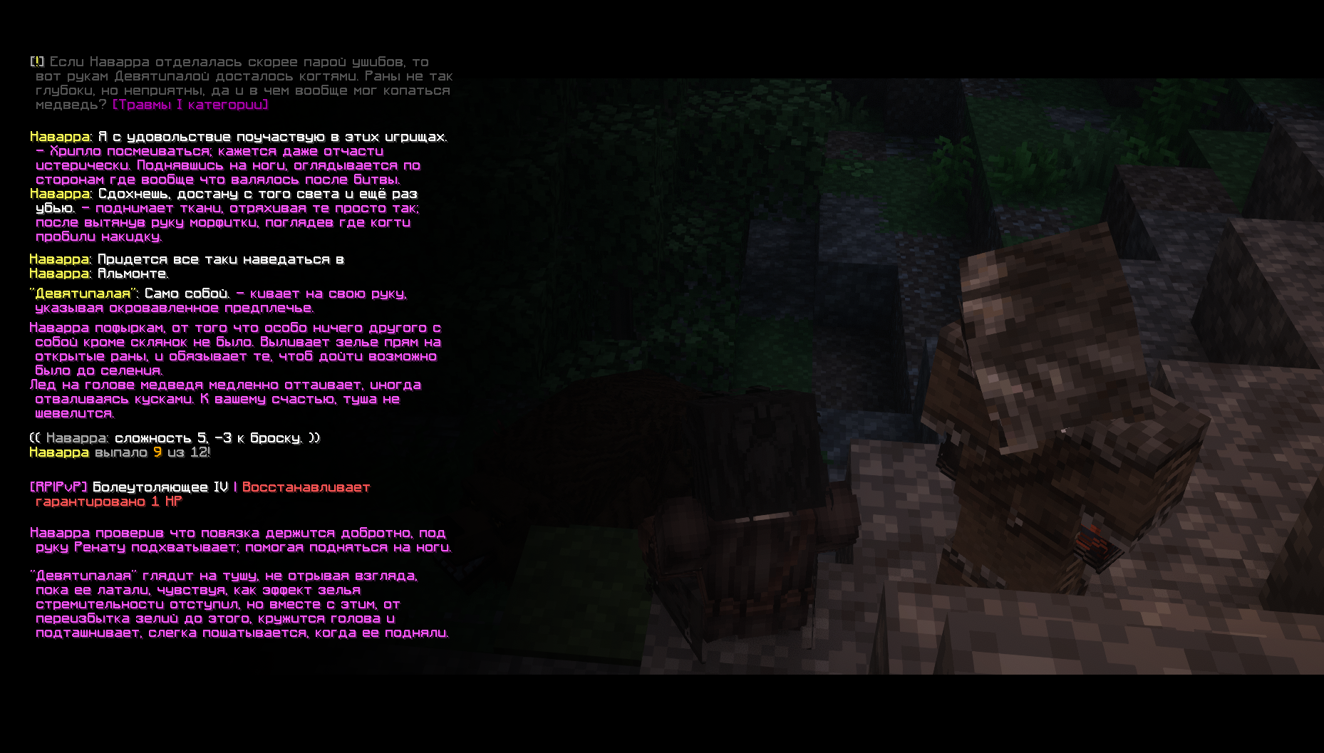 Ингредиентов в списке хоть и немного, но не все они безопасны, поэтому пока кашится ещё не полностью растворилась Изи вооружается повязкой и прикрыв ей нос она тянется за отрубленной кроличьей лапкой. На разделочной доске хрупкие суставы были сломаны ещё пару раз делая лапку ещё более мягкой, податливой. Отправив мясо в кипящую воду, остается ждать изменений, варева медленно меняло свой цвет на зеленый. Затушив огонь и добавив концентрат красной пыли, девушка разливает получившиеся зелье по склянками и убедившись в правильности цвета гордо демонстрируется “наставнику” свое творение. Пробовать он, конечно, это не стал, давая возможность морфитке самой получить “ценный опыт” но потом покумекал и предложил Изи подработку и виде ухода за наростами.