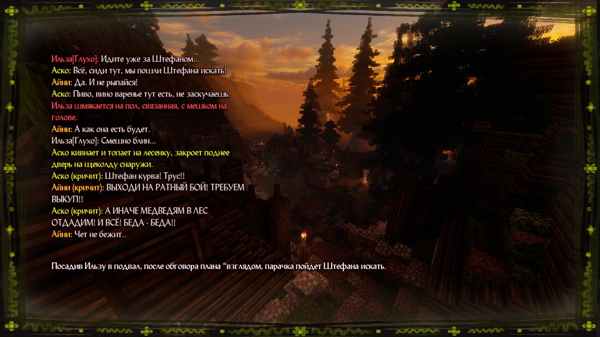 Не была с братом её жизнь скучна, ведь отчасти, они развлекались себя самостоятельно. То люд покошмарят в свободное время, то испортят что, как тот же общий суп травами после которых желудок "очищается", но тогда их общину дед сварливый посетил. Ходил хмурым, будто задумывался чего плохое, и уж тут то детки в стороне не стояли. Своих родных только они имели право доставать, а никак не черт с дороги. То подножку тому поставят. То одежду после купания всю украдут. Но все то было жёсткой игрой не более, покуда речь его те не за слышали правдивую. Сжечь он деревушку хотел, не принимая верование большинства в Ил-Ланеик. И тогда то началась истинная охота ребятни. График его подъема, примера пищи, и даже записывали когда тот по малой нужде в лесок отходил. Тогда то и произошла нападка на мужика. Один прыгнул ему на шею, зрение мешком на головы закрывая. Вторая под колени палкой ударила, заставляя на них пасть. И тут связанный беззащитным мужчинка понимая что спасения нет, стал их конфетами пытаться сдобрить. Возможно в голове её братца и пробегала мысль соглашения, но девочка как отрезав, привязала того к дереву и с помощью "рычага" свешала на дереве родителей приведя и заставив того всю правду рассказать. Тогда и братец Таррен свои пять копеек вставил о сущности которую тот видел в лице этого мужчины, от того на "суд" отправят. Далее история умалчивает его судьбу.