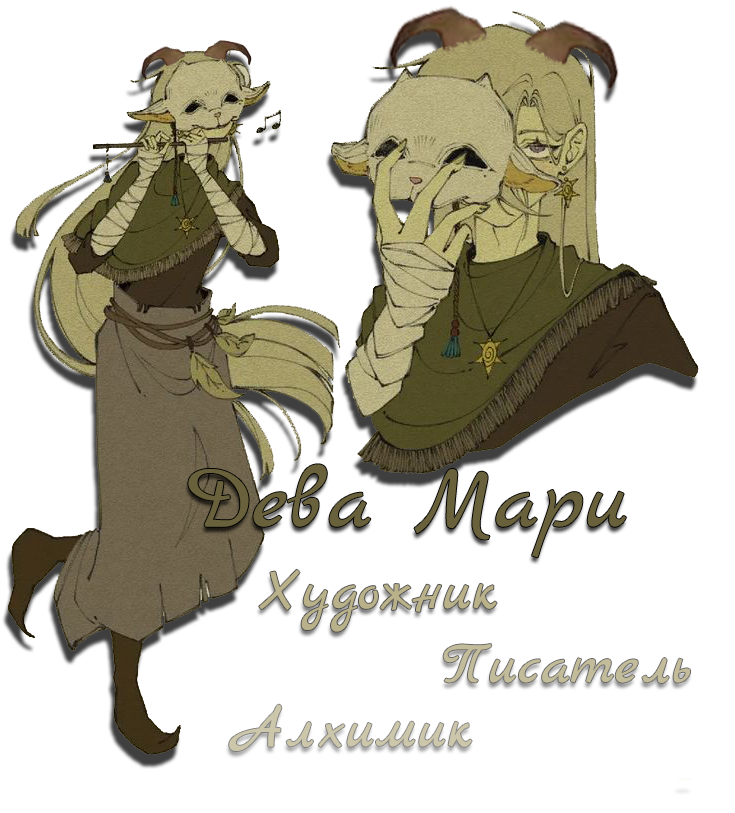 ♃ Внешний вид : Длинные волосы, белесого цвета, такое чувство, что та вовсе не стригла их с самого детства, те вьются и часто собирают в себя разные ветки и листья, белесые "мертвые" глаза, уши неестественного вида словно от какого то животного, как и рога на голове темного цвета закрученные в круг, постоянно в людных местах закрывает свое лицо тряпкой или платком, скрываясь от инквизиции. Носит закрытую одежду, обычно платья по пол, длинное тряпье что скрывает тело, скрывая такие же черные копыта как и рога вместе с остальной белой шерстью. На шее постоянно висит много разных кулонов связанных с ее культуры и суеверья в Лешего, созданные собственными руками, одежда в основном не чиста, но в основном из грязи на ней либо краски.