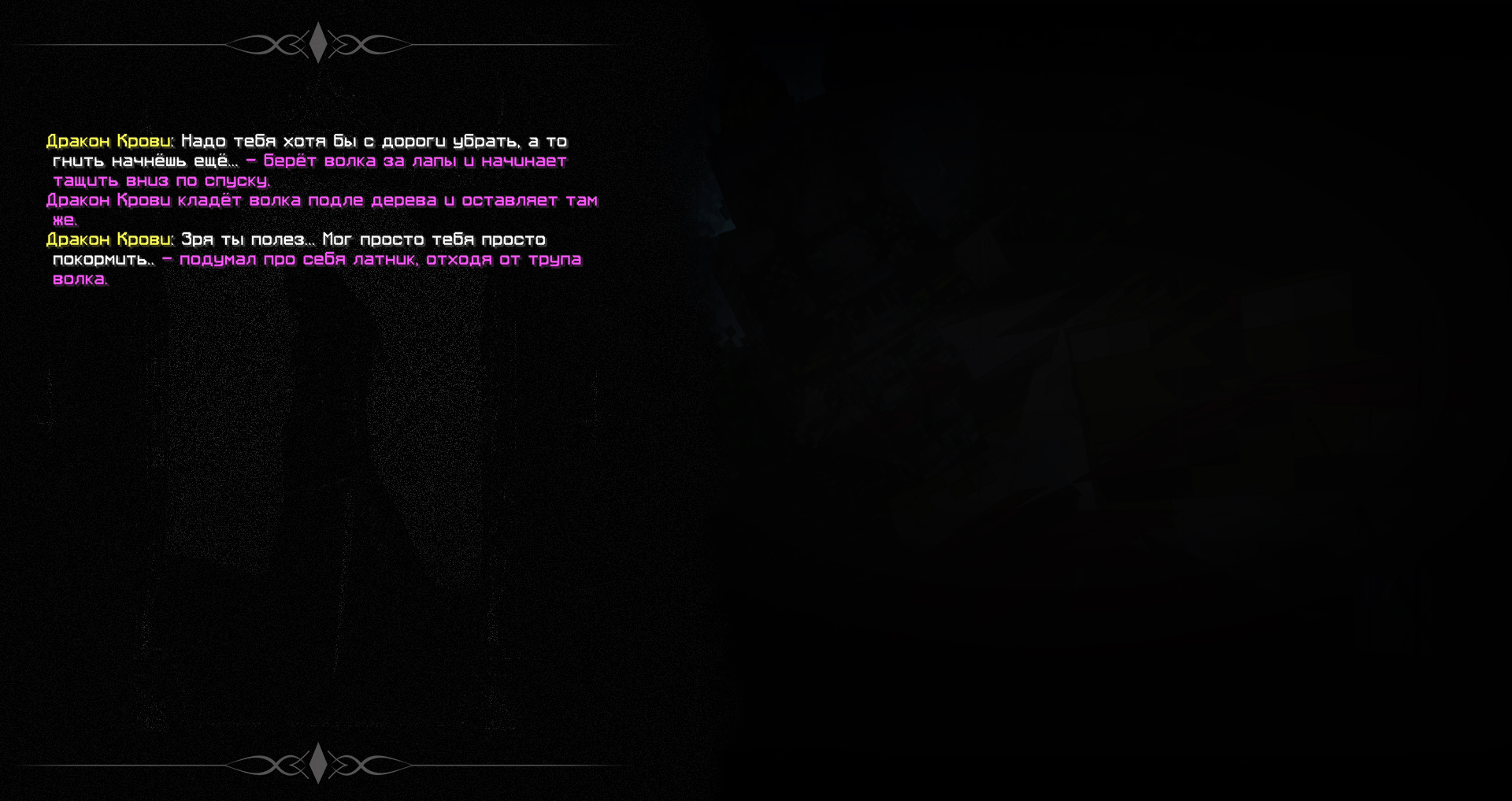 - Что? Ха-ха, нет, сынок, - рассмеявшись ответил мужчина, - мы - самые обыкновенные грабители и разбойники, орудующие на трактах и устраивающие набеги на небольшие поселения, чтобы поживиться вещами, которые их хозяевам совсем ни к чему. Они ведь не смогли за них вступиться, чтобы доказать свою принадлежность верно? - продолжая насмехаться дальше, спросил мужчина.