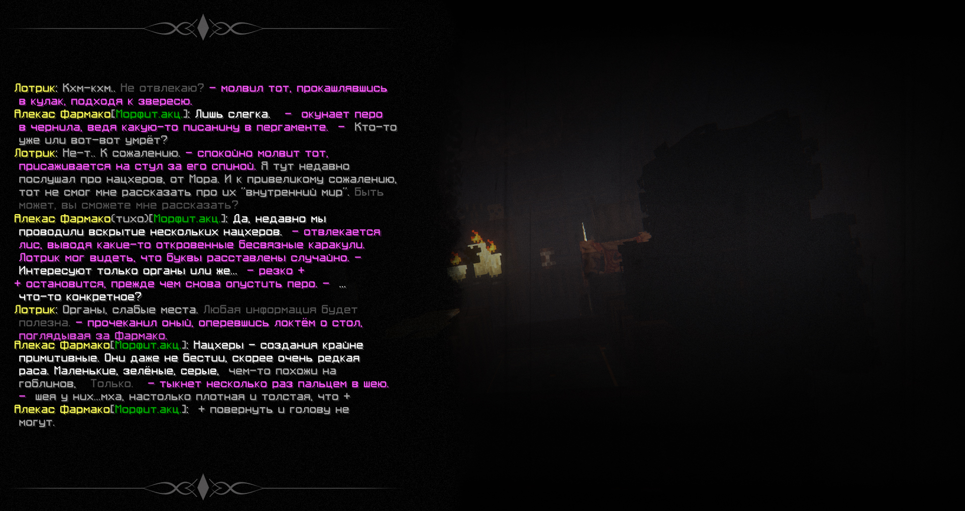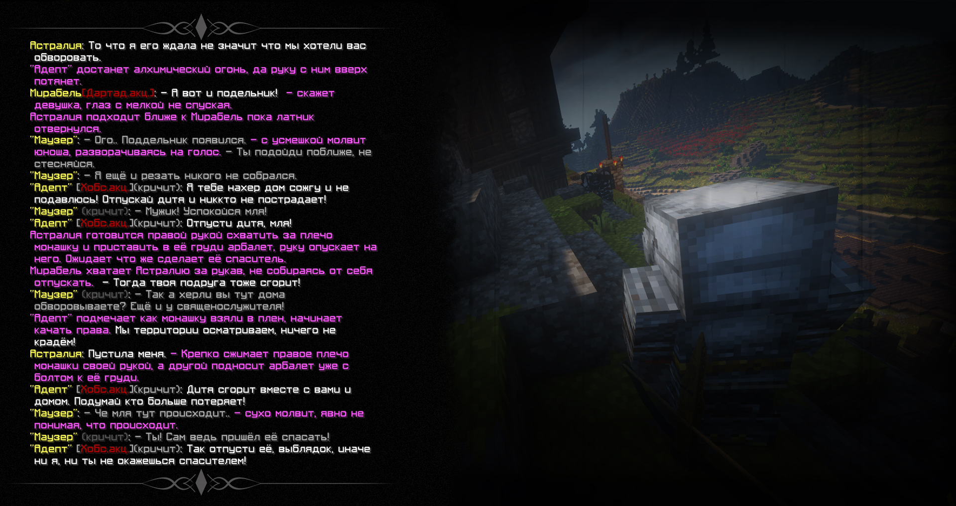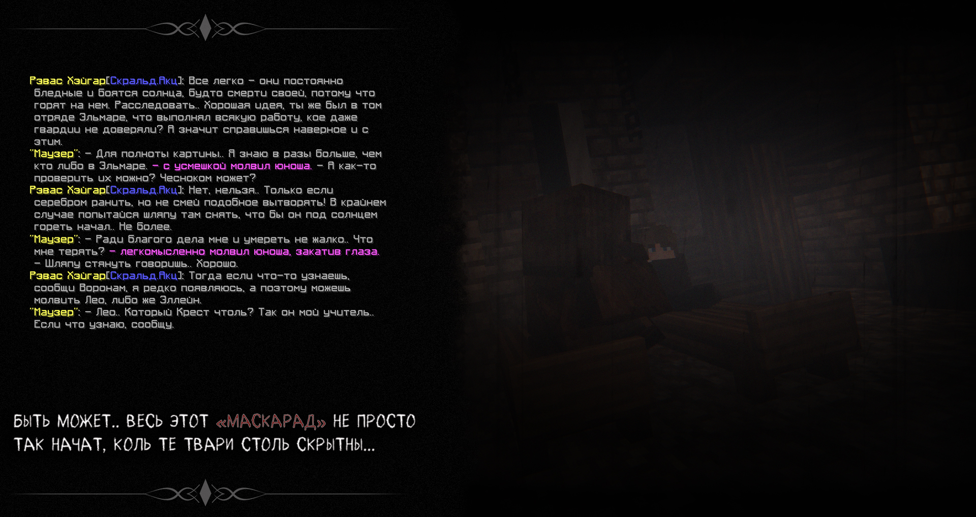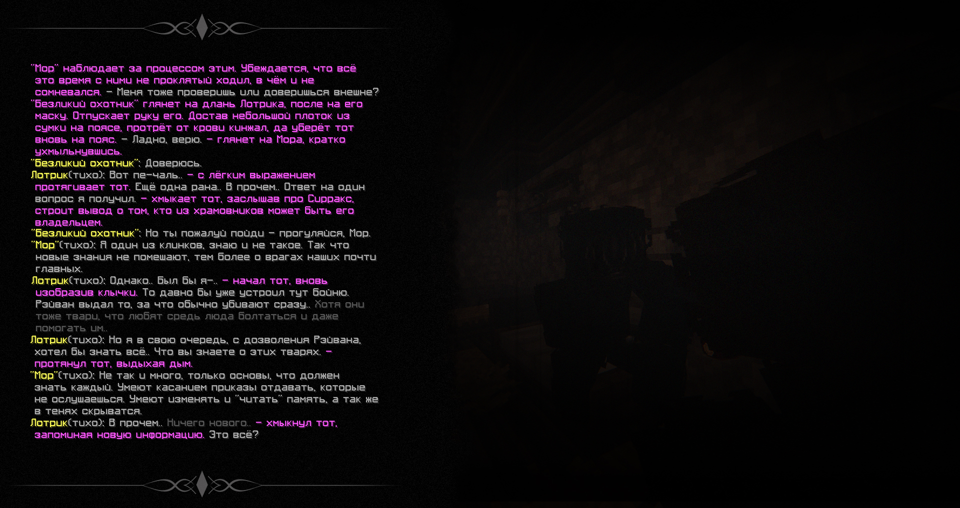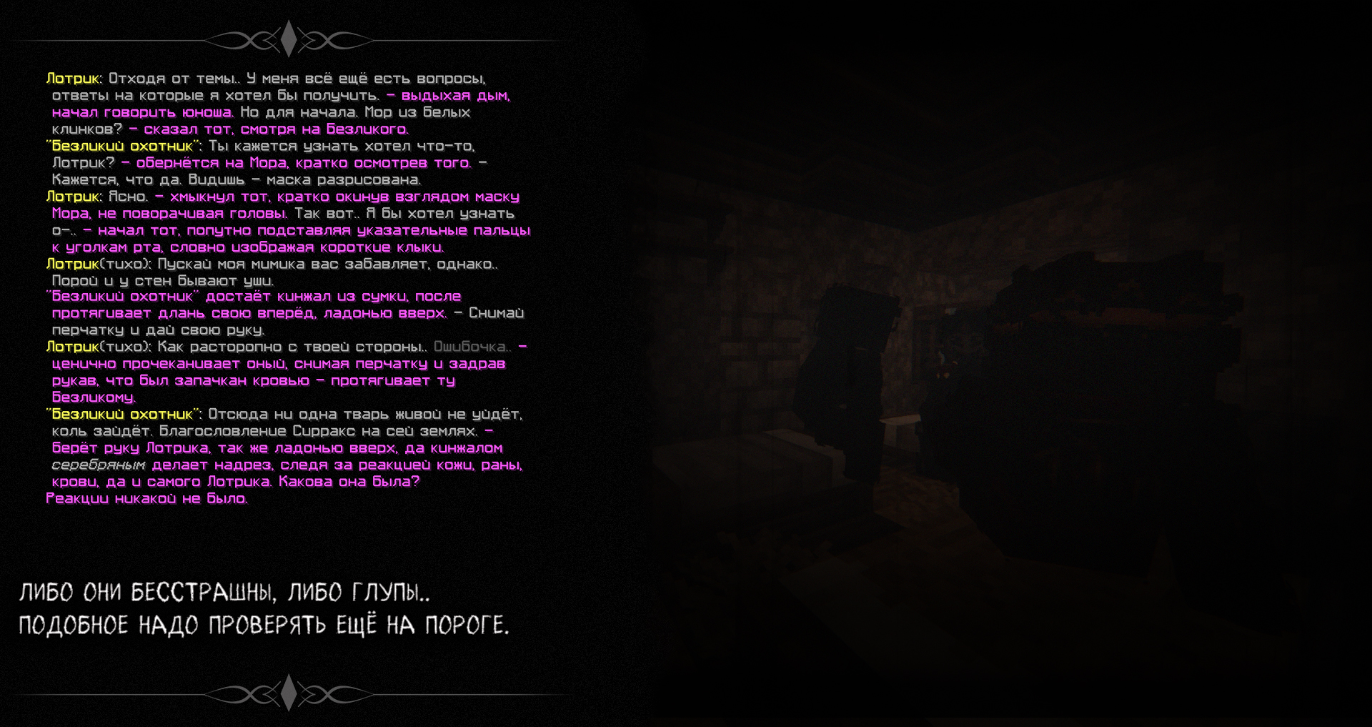 - Что? Ха-ха, нет, сынок, - рассмеявшись ответил мужчина, - мы - самые обыкновенные грабители и разбойники, орудующие на трактах и устраивающие набеги на небольшие поселения, чтобы поживиться вещами, которые их хозяевам совсем ни к чему. Они ведь не смогли за них вступиться, чтобы доказать свою принадлежность верно? - продолжая насмехаться дальше, спросил мужчина.