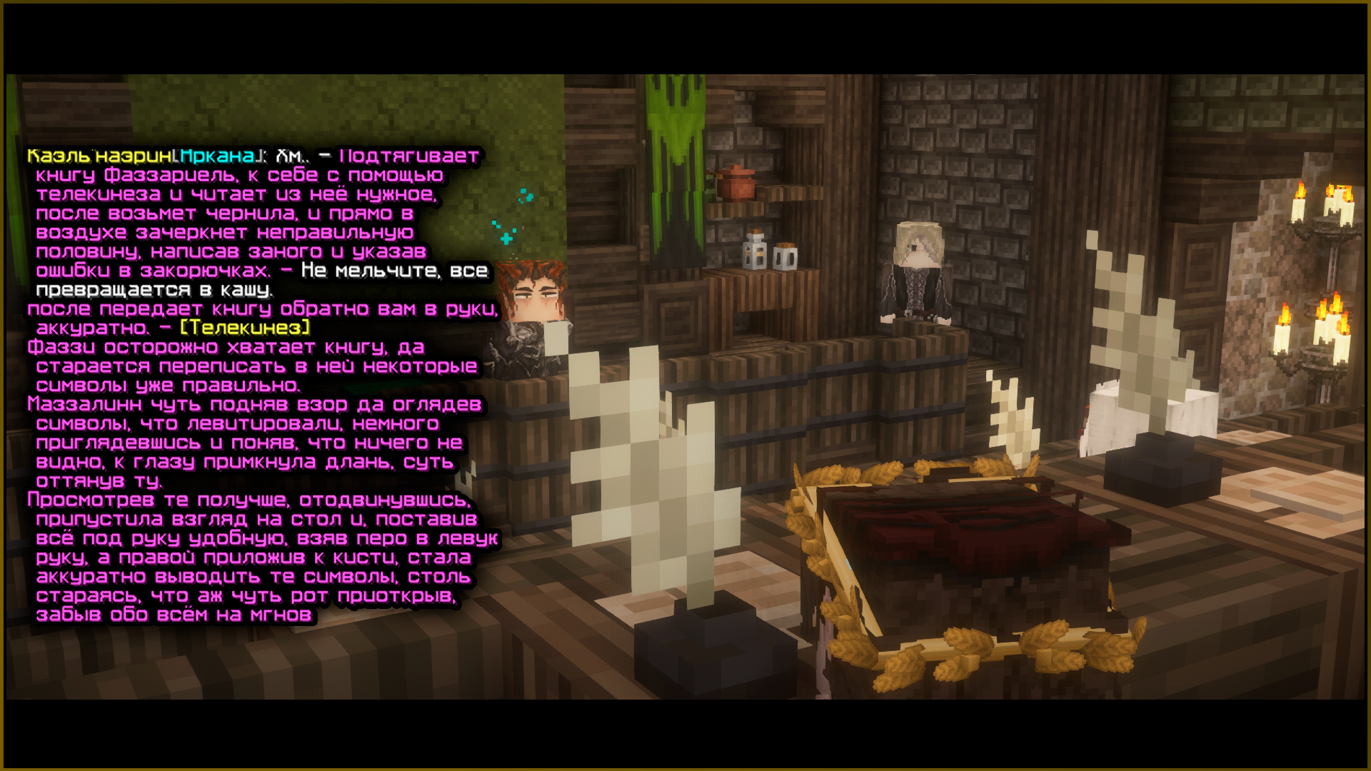 Парочка отправилась в жилище дворянина. Звересь мастерски и незаметно взломал замок на деревянной двери, а Морфит, надев маску и вооружившись ножом, стоял рядом, чувствуя, как его сердце колотится в груди. Кот сказал, что будет стоять на шухере, а Морфит должен был зарезать дворянина во сне. Войдя внутрь, Каэль'наэрин увидел уютную комнату, украшенную нотками аристократии. Дворянин спал на диване у камина, видимо, напившись. Морфит тихо прокрался по первому этажу, приближаясь к спящему ближе к дивану, как вдруг видит что книга на столе уже падает, и чтобы не разбудить дворянина тот решается с помощью управлениями ветрами магии притянуть к себе книгу не дав ей упасть [Телекинез].