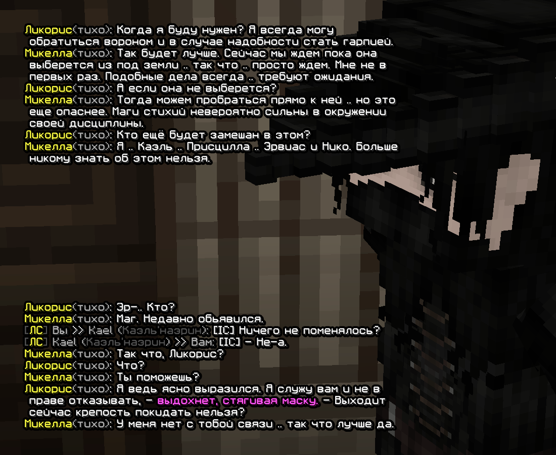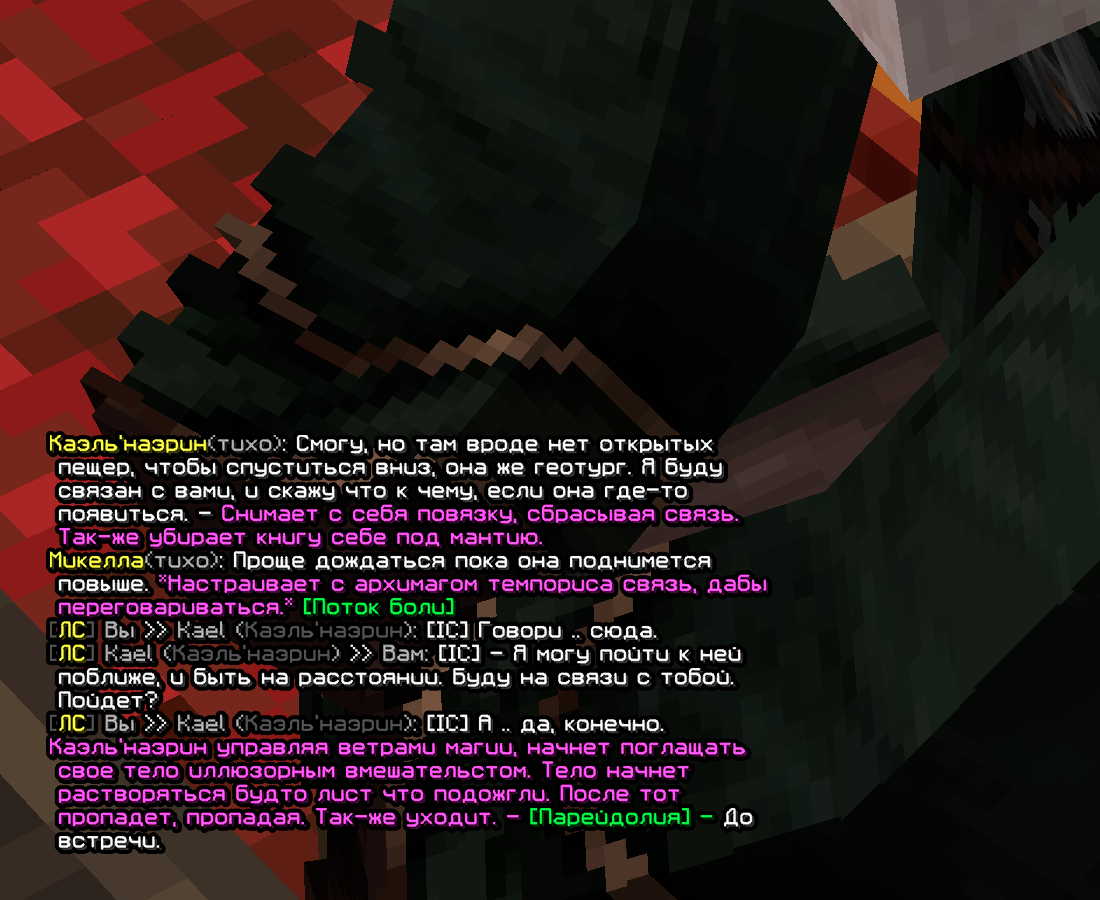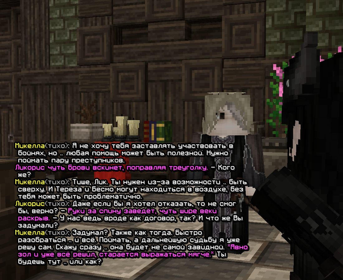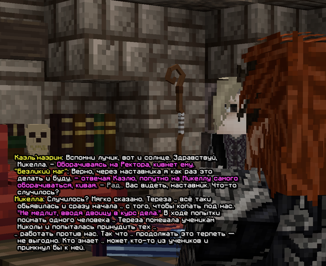 У моего персонажа были давние проблемы с Терезой и вопросы к ней; это, так сказать, — потомственное, идущее еще от наставника. От чего и шли обсуждения с ним же о её поимке. Причиной таким недовольствам служило постоянное раскрытие магии со стороны той, странные контакты с оборотнями, что не столь важно, и самое главное — укрытие магические преступники(Титус и Виктор Фаргус), а также — взаимодействие с охотниками. В итоге она сменила свою внешность, от чего след её как «Терезы» был утерян. Позже(уже при существовании академии) она появилась перед Микеллой как «Луиза», от чего их взаимоотношение выстроилось вполне себе спокойным(ведь претензий к неизвестной магичке, логично, быть и не должно). /Вновь перемещаясь вперед/ Тереза решает вернуться к корням и предстать перед магическим сообществом как .. Тереза. Микелла, учитывая что до этого она вела себя — спокойно и безопасно, решает оставить ту в покое и наладить /дружбу/, пытаясь понять действительно ли той можно доверять. Таким образом и строилась игра дальнейшие месяца. Периодически проверяя магичку — магик изменчивости прощупывал опасность той, обсуждая с ней её отношение к раскрытию магии, к примеру, и иные острые темы.