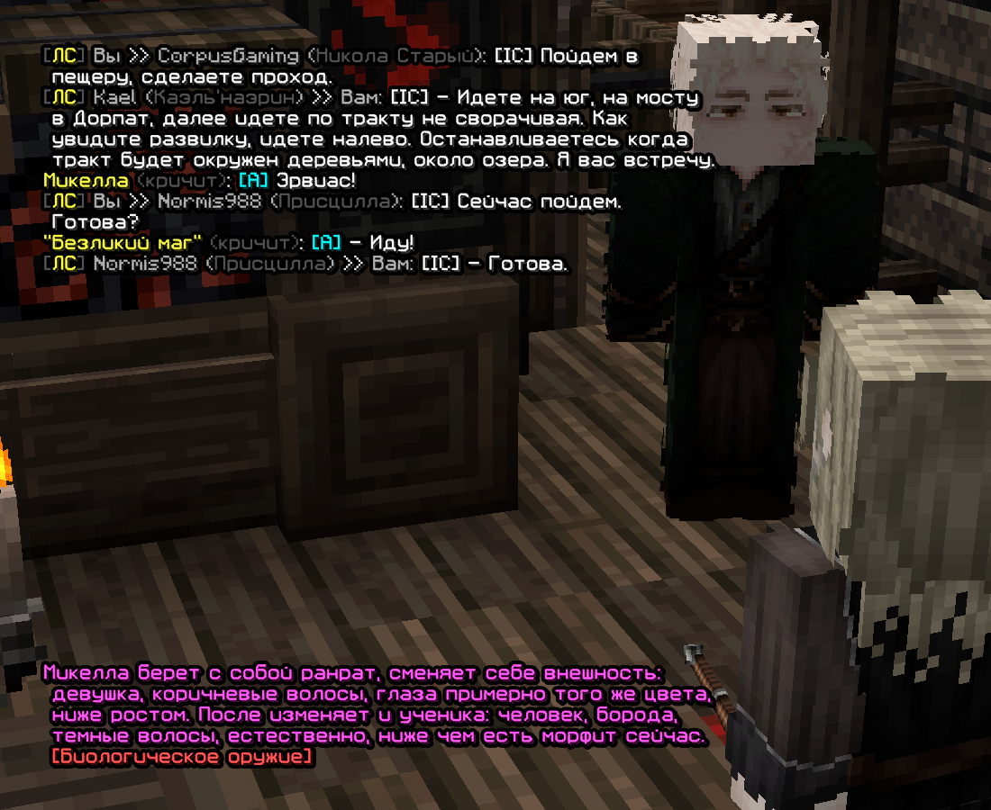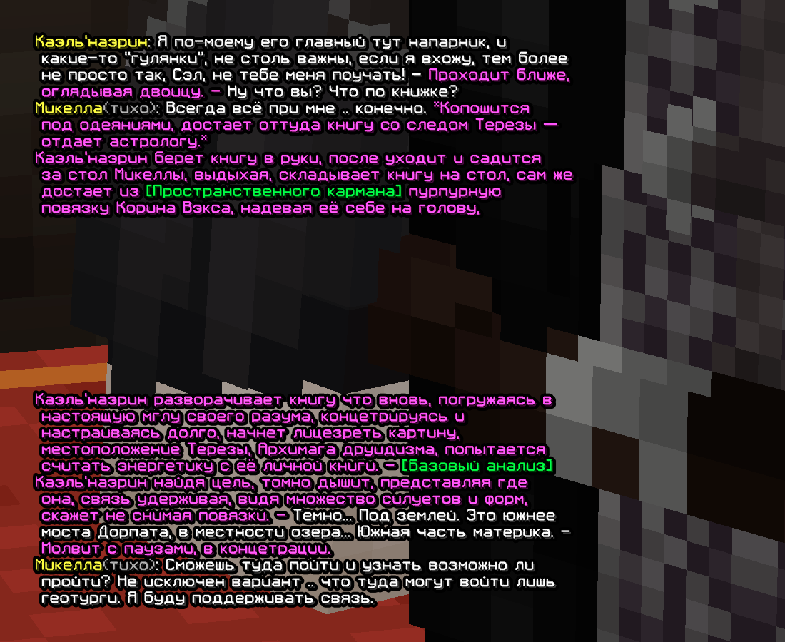 Вновь перемещаемся вперед. В ходе некоторых событий, магичка — Марсела попала в беду, раскрывшись как маг, от чего Микелле было необходимо изменить той внешность. Выбрав место встречи и собравшись там, на троицу(+ученик Микеллы) вышла двоица мужиков, что были охотниками. Естественно, оставлять тех в покое было попросту нельзя, ведь они видели Марселу рядом с другими магами, что в случае если их отпустить — добавит к ним подозрений. Начав бой, Микелла вместе с Магичкой одолели их, после чего архимаг приметил Герберта, о котором ему поведал один из слуг(человек был на ритуале полного /рабства/, так что в Микелла и не сомневался в его словах). Дальше Малакус позвал Каэля и двоице прочли память. Там вскрылось еще и то .. что Тереза помогала им, раздавая реликвии! Реликвии охотникам.