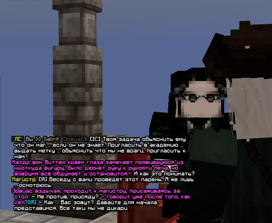 В данный момент маг не подозревает о своей причастности к маг.сообществу. Он видел, как система, которая должна защищать слабых, разлагается от влияния эгоистичных людей, которым просто удалось заполучить больше силы или власти, из-за случайной удачи, или вовсе по праву рождения, видел как с виду честные люди, тут же меняются под влиянием условных денег, видел как ленивые и недостойные поднимались выше, в то время как у тех кто старался изо всех сил нечего не выходило. Пережив поднятие с низов к вершине и дальнейшее падение с неё, он прочувствовал всё это на самом себе. Сейчас он будет по большей части зашуганным пареньком, попавшим в неизвестные ему земли, который старается хотя бы просто освоиться на них. После поднятия ранга к юному магу придёт осознание своей силы и возможностей, но хоть он и стал сильнее, но явно не всемогущ, так что идти наперекор обществу он не станет, первоочередными его целями будут: укрепление своих позиций в маг.сообществе, поиск не столь единомышленников, сколько тех кто не будет ему мешать, а порой и вовсе сможет помочь, как среди магов так и среди обычных людей, получение как можно более обширной информации о мире, влиятельных людях и существующих фракциях.