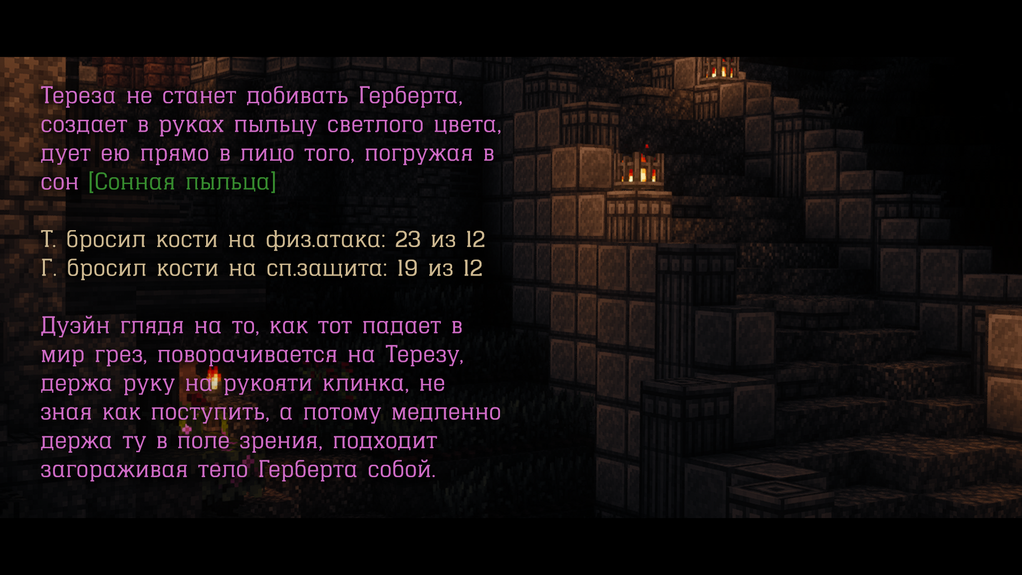 Она закрывала глаза, но видела перед собой его лицо — лицо ребёнка, которого она никогда не увидит, лицо невинности и боли, которая больше не покинет её. Каждый день она боролась с этими демонами, что поселились внутри. Её преследовали тени прошлого, глухие шёпоты, от которых она не могла спрятаться. Голова гудела, словно внутри был тяжёлый молот, бьющий по раскалённому металлу. А ночи были самыми тяжёлыми — бессонница, но в один из таких дней что то переменилось, [Сладкий сон] - она чувствовала неймоверное расслабление и тишину, погруженную в тихую агонию... Это было счастье не описуемое жизнью. Подобным страданием и тяготами она на приближенные Хаккмарские земли.