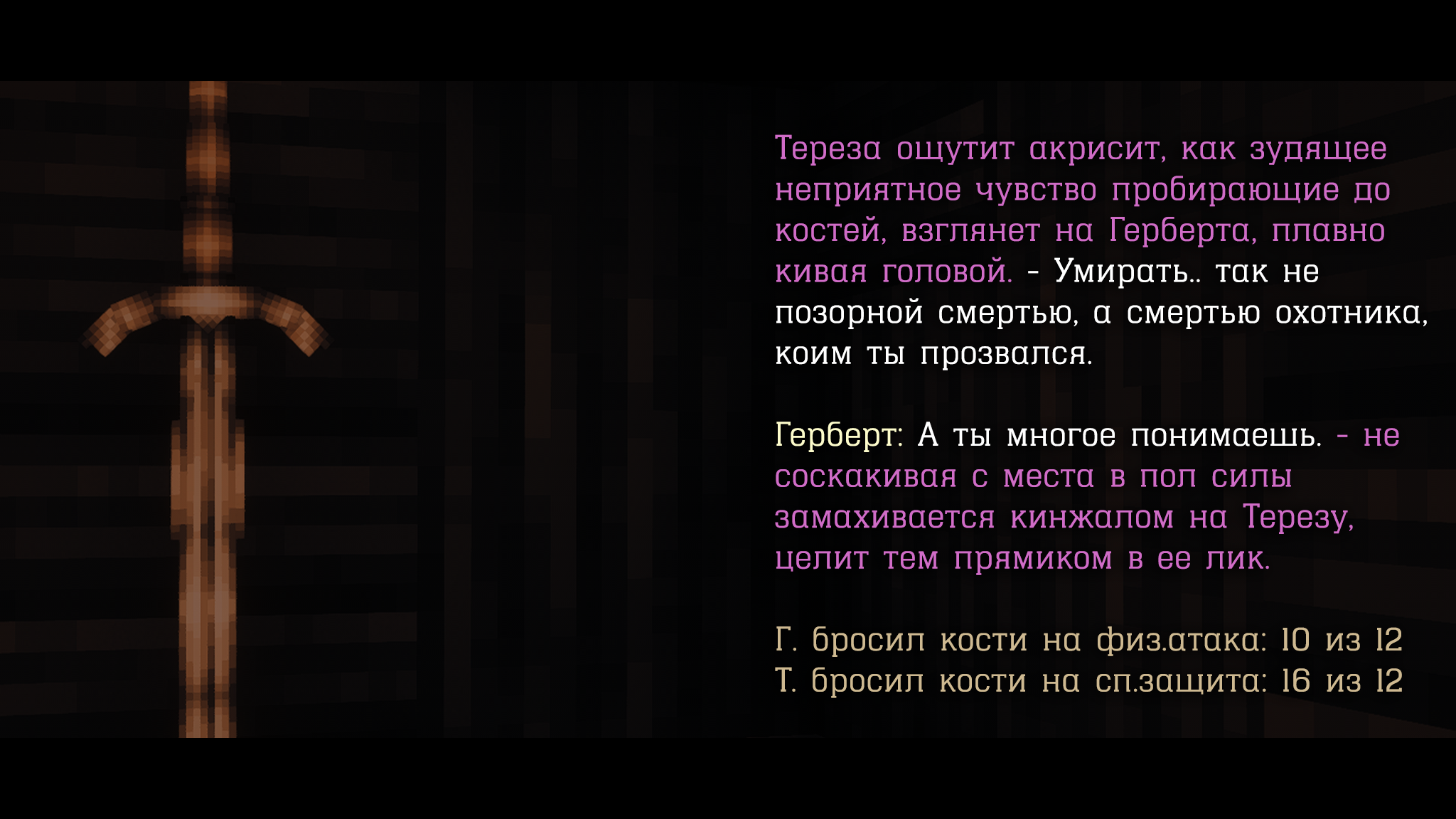 [Оборотень] - Мы отличимы от животных - они лучше нас. Данная способность наделит персонажа силой, при которой та сможет как парировать так и атаковать, быстрее передвигаться, дабы сбежать от проблем либо же спасти товарища.