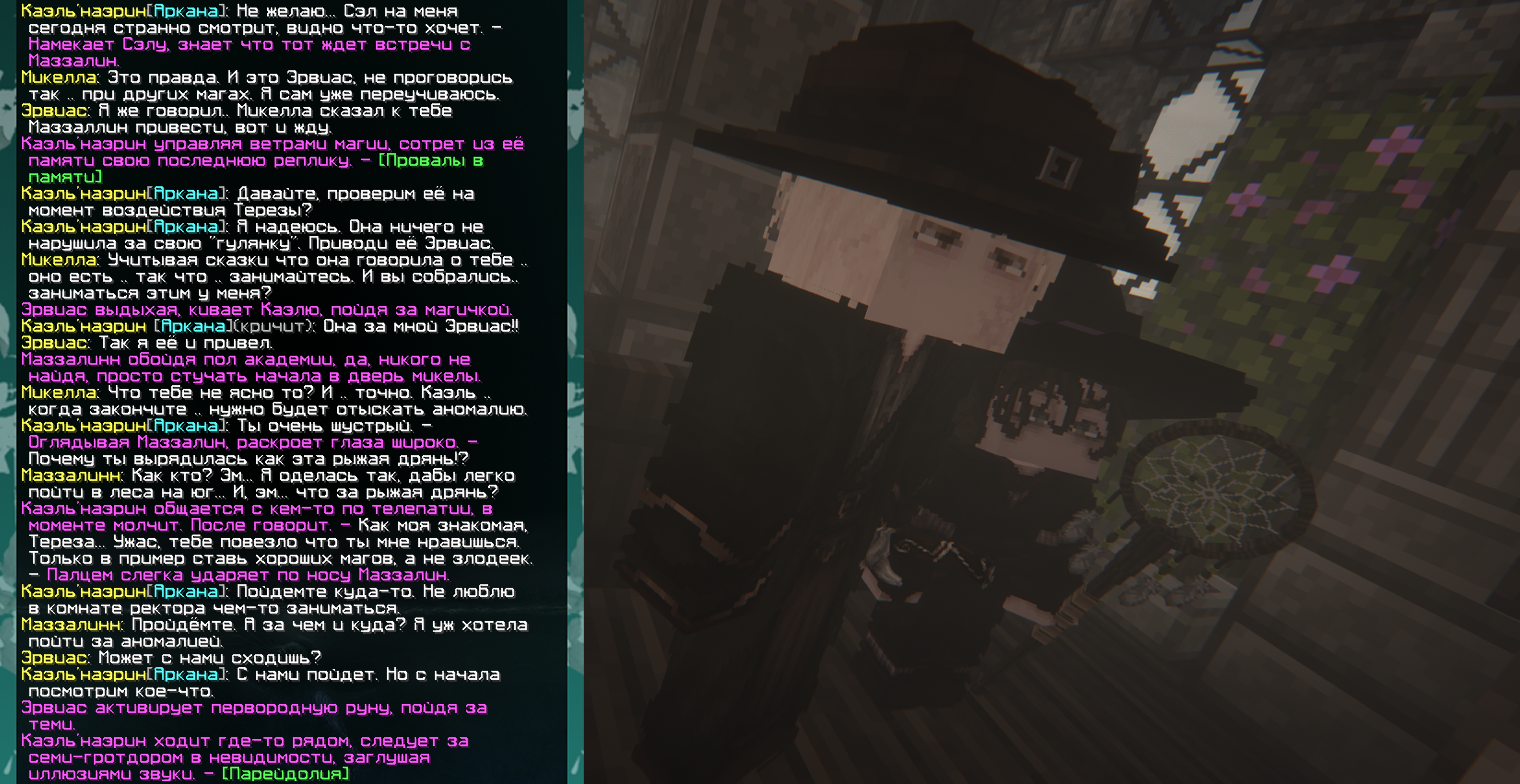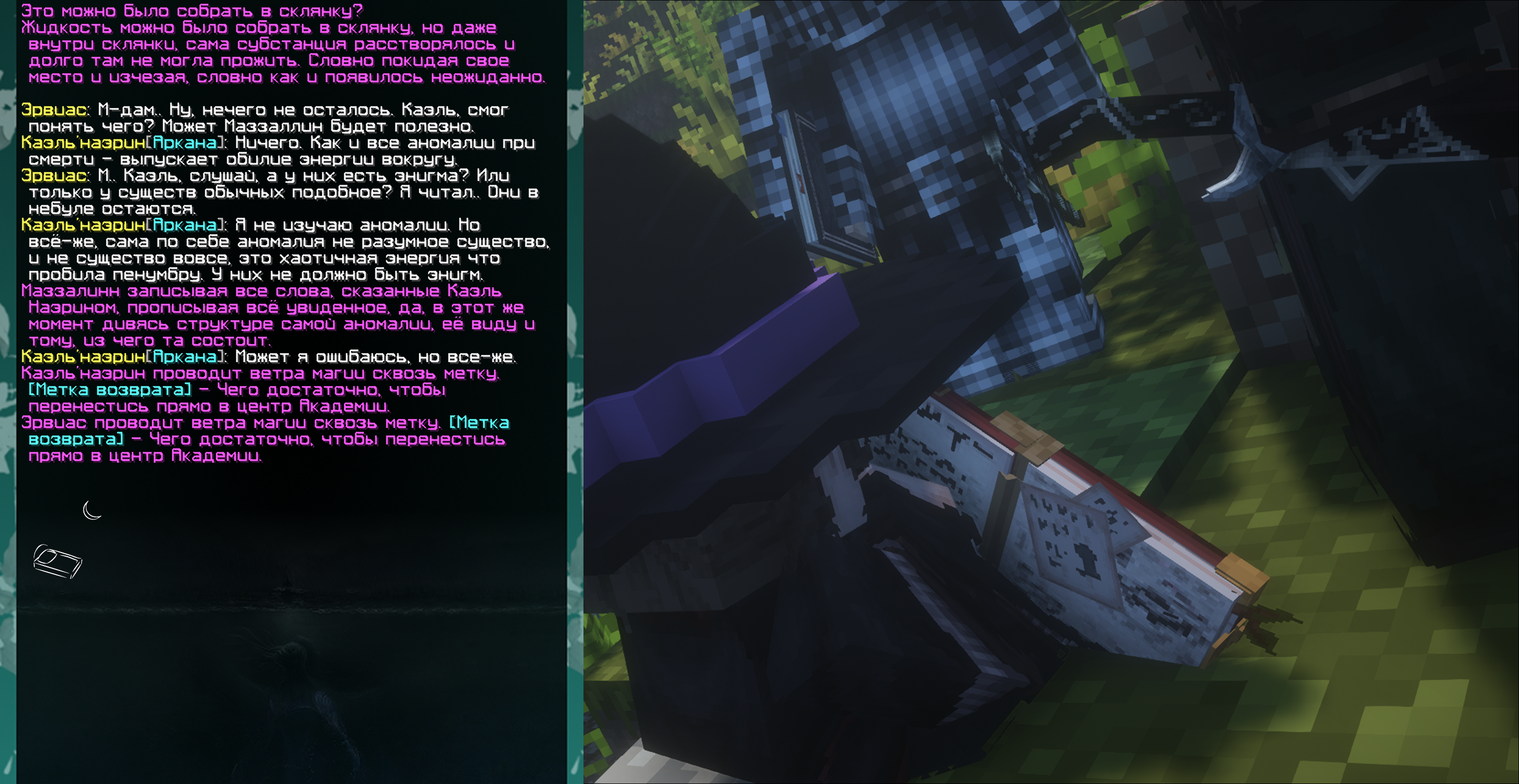 Пример: Маззалинн, придя в обсерваторию других магов, начнёт утверждать, что телега, сделанная из магического металла, сможет сдвинуть аномалию с места и её можно будет перевезти куда угодно. Взяв свою книгу и нарисовав там множество картин перевозки с глупейшим текстом, и, отталкиваясь от него, жестикулируя руками, она будет показывать, насколько это важно для неё, и что, если она права, то сможет обогатиться и найти способ обезопасить свой и ваш дом от появления аномалий!