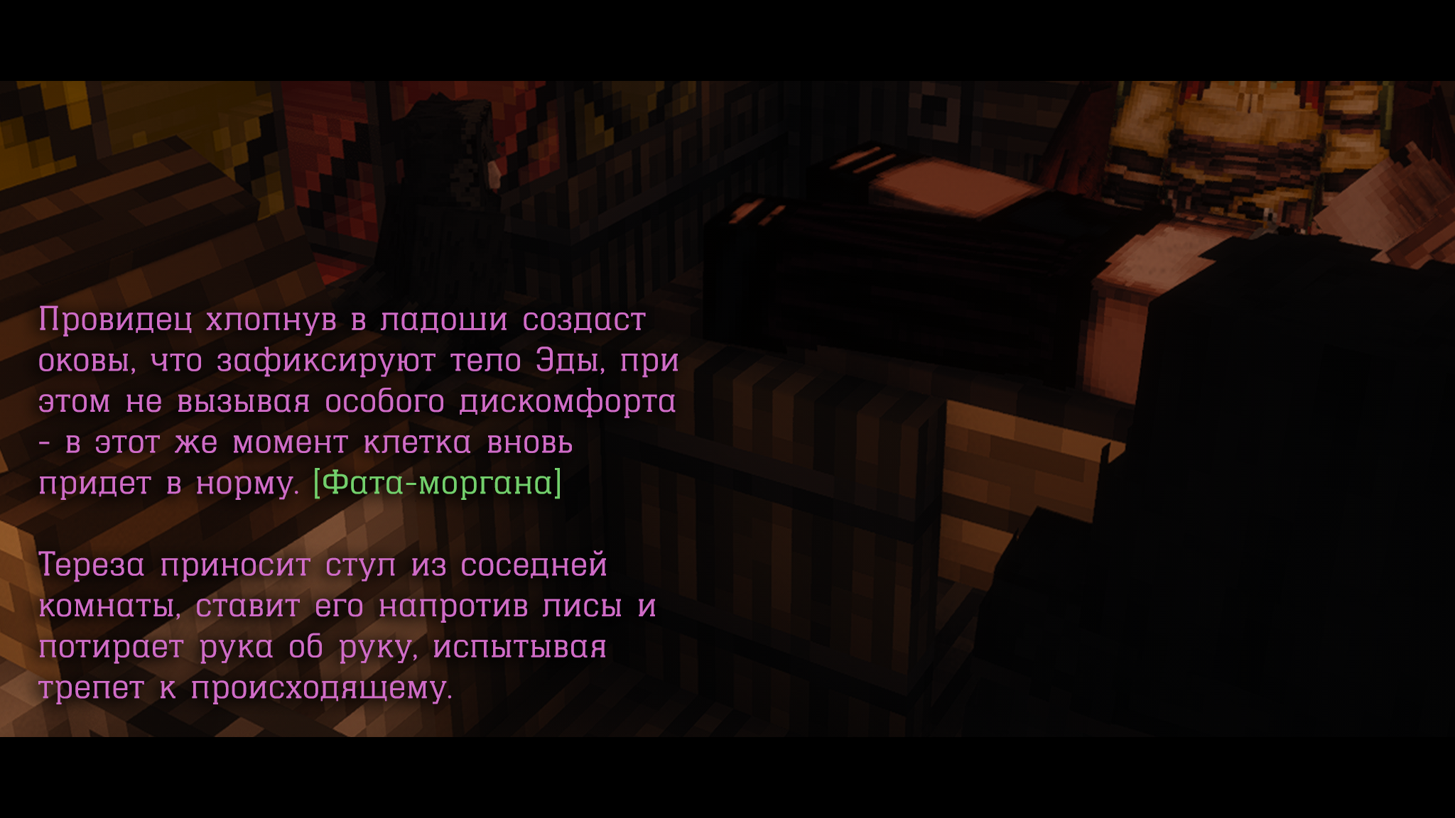 Нейтрализация. Получив доступ к страхам (скажем, клаустрофобии или утопления), он применяет [Прорицание]. Жертва вдруг обнаруживает себя в полной, давящей темноте крошечного каменного мешка, или её лёгкие начинают захлёбываться ледяной водой, которую невозможно откашлять. Иллюзия воздействует на все чувства, делая кошмар абсолютно реальным. Цель - не пытка ради страдания, а максимально быстрый и полный психологический слом, после которого преступник перестает быть угрозой.