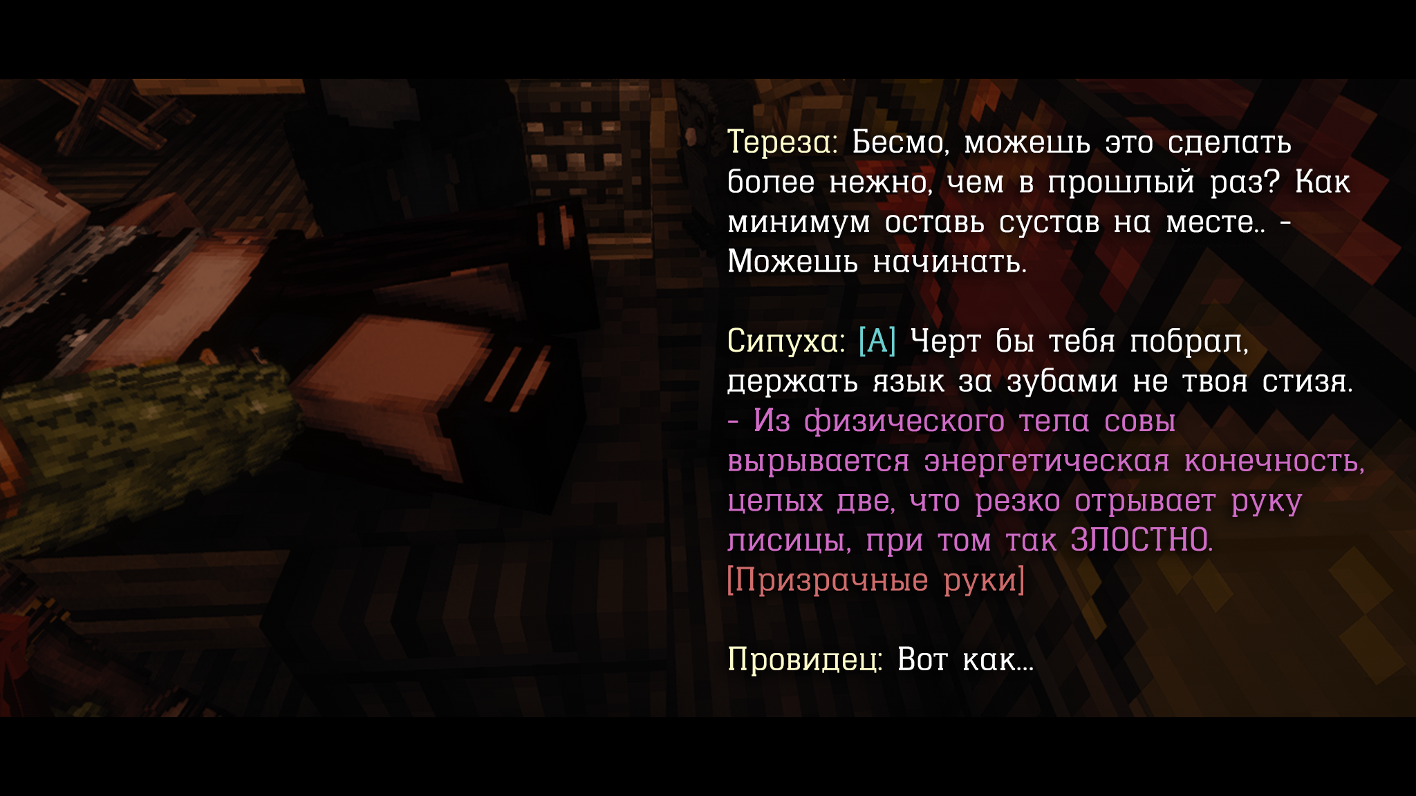 Железное правило. Любое нарушение «пакта» со стороны Бесмо, будь то причинение вреда невинному для подпитки, сокрытие информации или враждебные действия мгновенно аннулирует сделку. В этот момент Бесмо из союзника-информатора мгновенно переквалифицируется в цель для ликвидации. Ирвин применит против него всё, что изучил: его самые глубокие страхи, выявленные за время сотрудничества, станут оружием для быстрого и окончательного подавления.