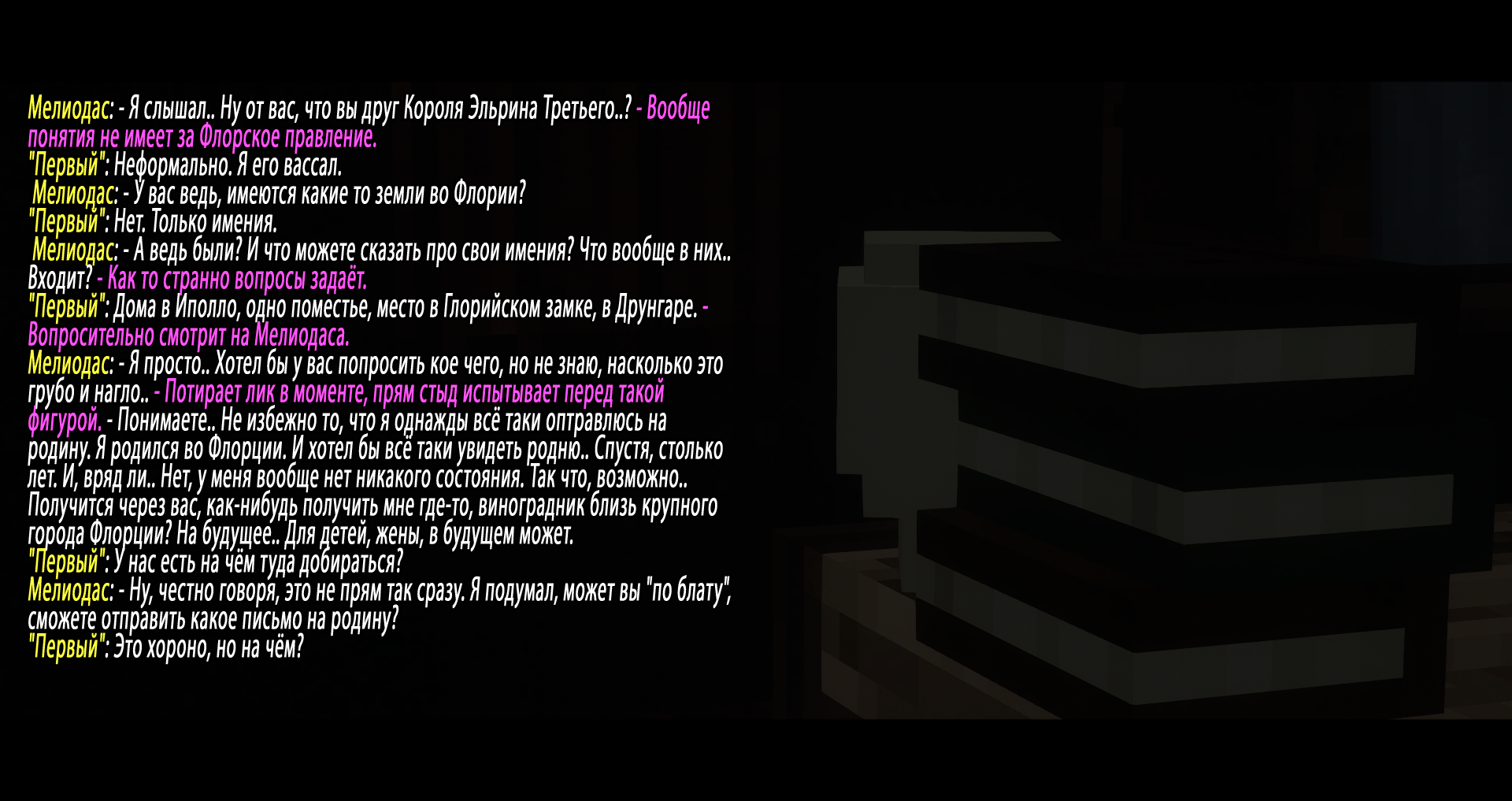 Вообще после этого момента чуть чуть сложилось понимание того что есть внутри него и чем он владеет, но толком это не принесло ответов, разве что решения - не говорить и не показывать, а самое главное использовать в своих целях и идеологиях которые конечно же никуда не делись, но здраво так дополнились тем что недавно заимелось. И вот порог шести летнего возраста преодолён, юный мозг заимел в себе свои желания и амбиции а посему уставший от серого вида города которые ещё больше в этот оттенок угнетения красили мысли и идеи, Мелиодас решает.. Сбежать, да, вот так просто. И тут ну сам Флоренд дал, подвернулся момент, дядька со своими дочерьми и женой приезжает через недельку в гости а потом уедет и это просто отличный вариант сесть в телегу или под неё где то там за что то зацепиться. Впрочем так он и сделал когда встреча уже подошла к концу, хорошо продумал варианты побега в голове и прочее и начал действовать и… Это просто что то с чем то ведь у него получилось! Флоренд видит держась без брани отметить стоит что действительно у юного Мелиодаса получилось покинуть пределы родного города. Так и сяк добрался с перебоями до Арии-Павьоры, там подсел к какому то бродяге который видно по заплатке на штанах и куртке, дырявому сапогу и одному отсутствующему мать родную продаст да стекляшку спиртухи палённой кое как согласился провести до Эирини и быть обманутым Мелиодасом что бы безопасно добраться до города и в нём же кое как пролезть правда с третьей попытки, на корабль да укрыться под мешками картошки где то в трюме и отправиться туда не зная куда главное что бы не на одной земле жить с роднёй которая не понимает интересов и намёков на идеи своего сына. Кстати прошлые две попытки не увенчались успехом поражения ведь стража доложила о нахождении паренька здесь, в столице домой и надо было думать что то срочное. Благо то ли удача, то ли Флоренд сам аль вовсе нечто иное заставило оказаться Мелиодаса в разных стражницких казармах.