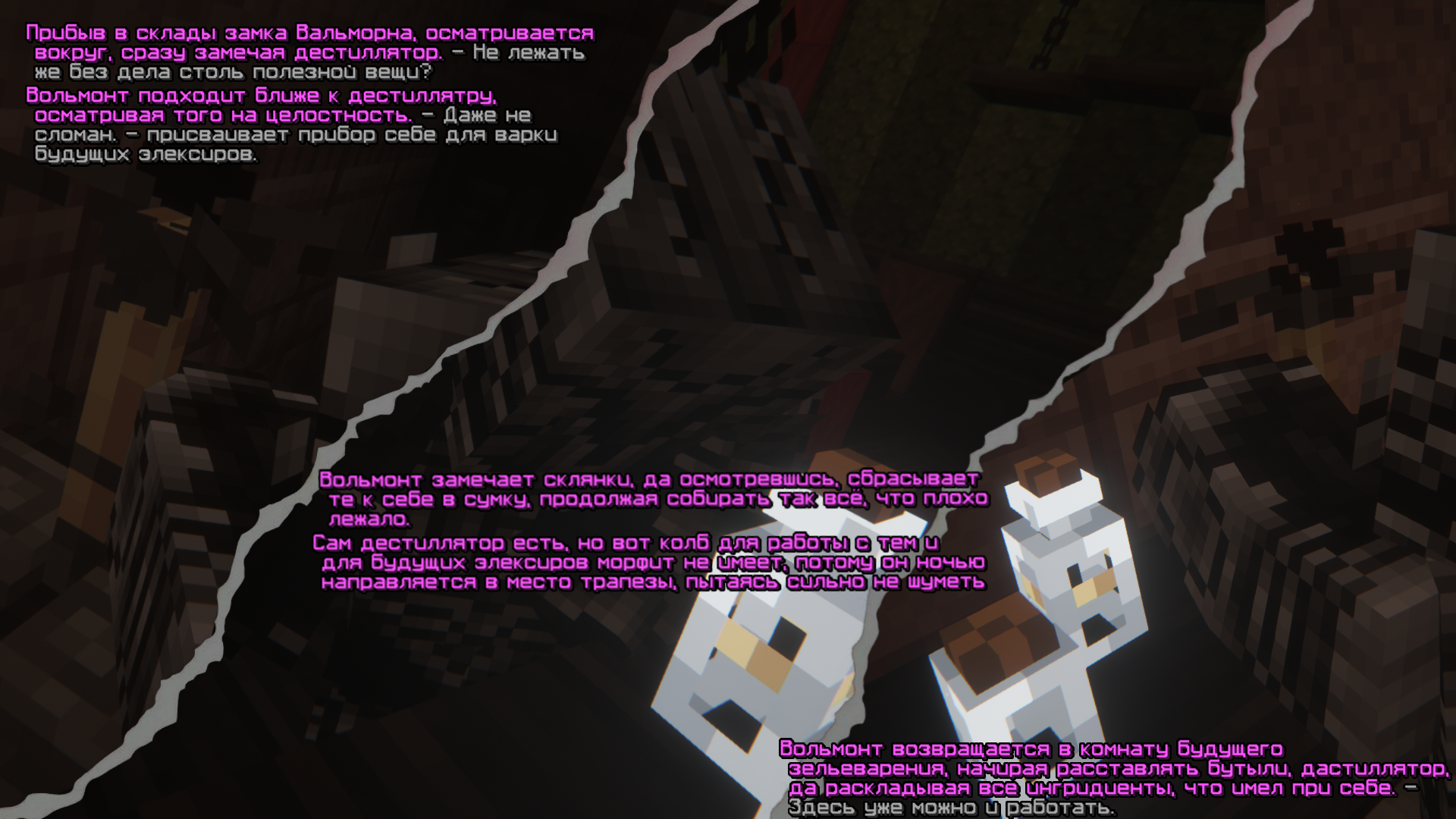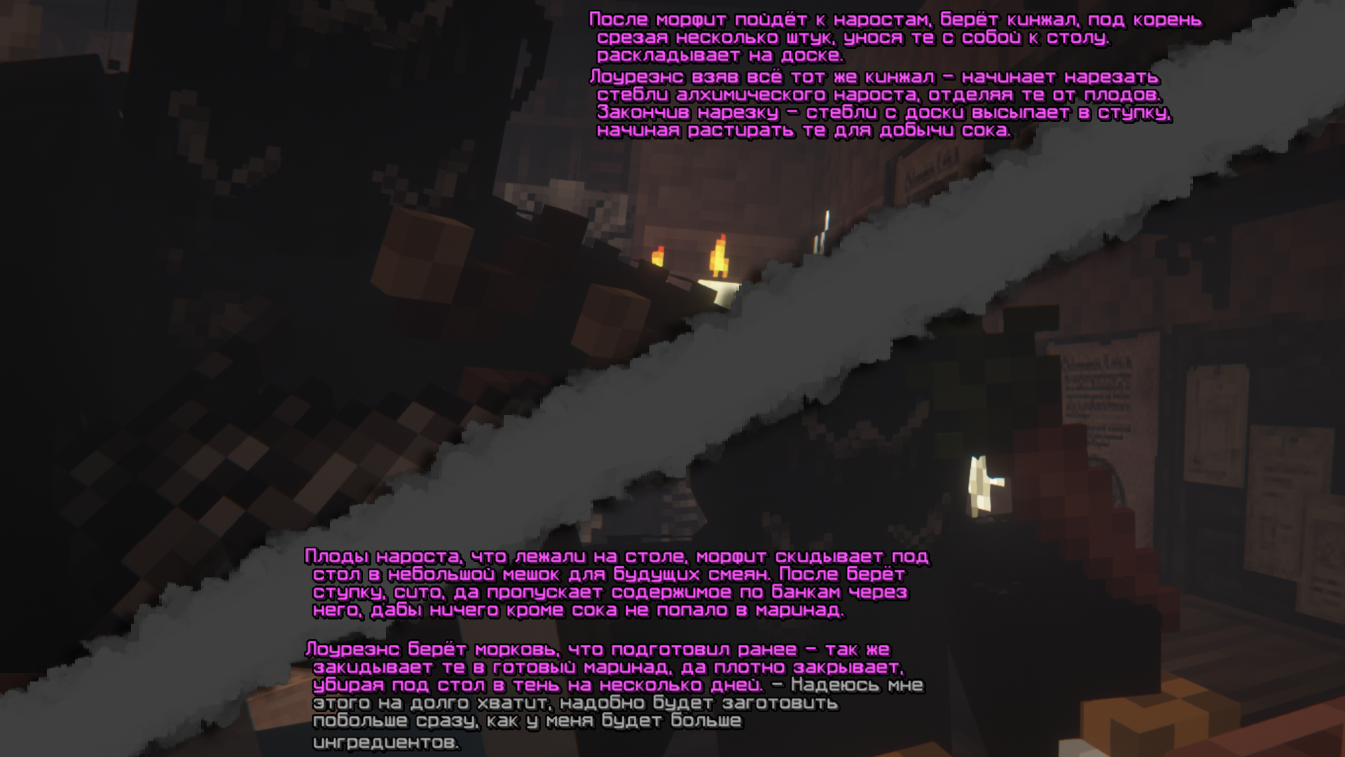 Новый проект (7).pngСолнце зашло, а значит - время пришло. Зайдя открыв с лёгкостью окна, что вели на тёмные переулки, воры забрались в алхимическую лавку. Остерд сразу начал собирать ценные ингредиенты для зелий, письмена и книги, пока его сообщник ловко взламывал замки ларца и забирал звонкие монеты. Так уже спустя получаса алхимическая лавка была пуста, а мешки грабителей полны добра. Выходя всё с тех же окон с полными мешками, через узкие и тёмные переулки воры направились к хижине, успешно закончив своё первое дело. Остерд чувствовал вину за содеянное, осознавая тяжесть своих действия, риски и дальнейшие последствия. Но такова жизнь. Уже на следующий день человек, что был его сообщником, начал обучать взламывать замки при помощи отмычек, с утра до ночи объясняя устройство разных замков и способы их взлома. Так Остерд зарабатывал на еду и доставал ингредиенты, что нельзя было просто найти в лесах Мэр-Васса. Уже при помощи ингредиентов и оборудования, что смог украсть - морфит продолжал изучать алхимию, желая как можно больше помочь отряду охотников и всё ещё желая разгадать. Флористика давалась довольно просто, но в дальнейшей практики варки без наставника возникало не мало проблем и казусов, что часто убивали подопытных животных.