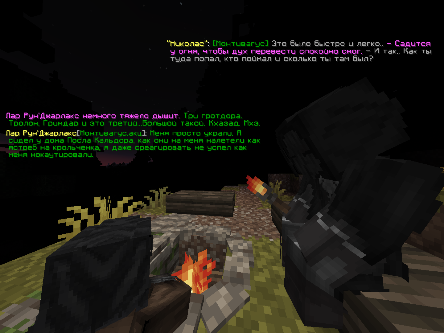 Но вот однажды в их и так не особо спокойной жизни произошло страшное. Тёмной ночью их отрядец решил сделать привал после удачного заказа. В предвкушении платы за работу разожгли огонь, поставили палатки и Лес.pngначали восхвалять Богиню Смерти за удачную охоту. Но вдруг деревья озарило свечение, будто чей-то крайне яркий фонарь. Отец, увидев свет, уже рефлекторно припорошил костёр снегом, скрыв свечение его за мгновение, и быстро дал детям знак о том, что следует собираться и не шуметь. Притаившись в лесу, они наблюдали за свечением вдали, которое никак не хотело гаснуть, а ещё хуже — двигалось в их сторону. Факелы или лампы не могли издавать такого яркого свечения, как это, а шагов людей или звуков лошадей слышно не было, что показалось странным семье дхарши. Долго выжидая в лесу и наблюдая за светом, их терпение подходило к концу, а любопытство всё усиливалось с каждой секундой. Было принято решение, что отец отправится на разведку и разузнает, откуда идёт источник такого сильного света, а дети пойдут чуть дальше от него следом, чтобы, если что-то случится, не подвергать опасности весь отряд. Выстроившись в линию и разойдясь друг от друга на пятьдесят шагов, они стали приближаться к свечению, медленно и с опаской приближаясь всё ближе и ближе, пока не стали наблюдать одно из чудес этого мира.