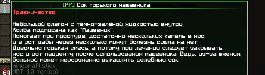 Описание: Небольшой флакон с тёмно-зелёной жидкостью внутри. Колба подписана как "Машевник". Помогает при простуде, достаточно нескольких капель в нос и в рот дабы через несколько минут болезнь сошла на нет. Довольно горькая смесь, а потому при лечении следует закрывать нос и рот пациенту после использования машевника. Ведь, из-за жжения, больной может неосознанно выкашлять целебный сок.