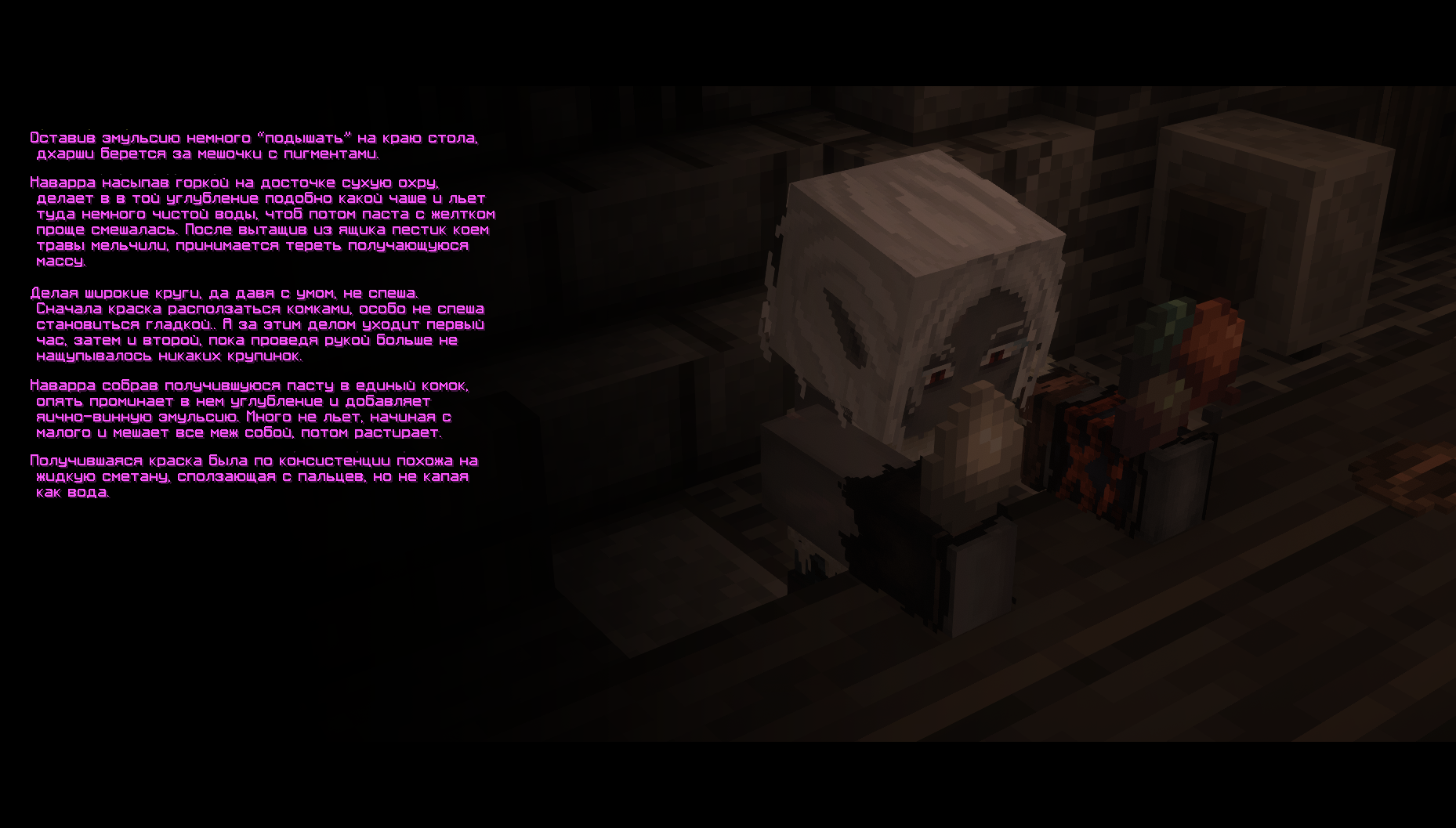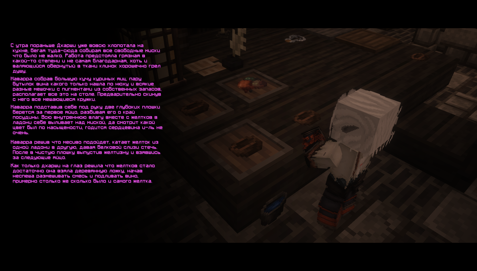 Ингредиентов в списке хоть и немного, но не все они безопасны, поэтому пока кашится ещё не полностью растворилась Изи вооружается повязкой и прикрыв ей нос она тянется за отрубленной кроличьей лапкой. На разделочной доске хрупкие суставы были сломаны ещё пару раз делая лапку ещё более мягкой, податливой. Отправив мясо в кипящую воду, остается ждать изменений, варева медленно меняло свой цвет на зеленый. Затушив огонь и добавив концентрат красной пыли, девушка разливает получившиеся зелье по склянками и убедившись в правильности цвета гордо демонстрируется “наставнику” свое творение. Пробовать он, конечно, это не стал, давая возможность морфитке самой получить “ценный опыт” но потом покумекал и предложил Изи подработку и виде ухода за наростами.